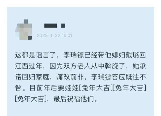 据知情人透露,戴璐事件风波已过,经过双方父母从中斡旋,戴副局长承诺痛改前非,回归家庭,镖哥也不计前嫌了,带着“爱妻”回江西老家过春节了,两个人还计划年后要个兔宝宝。