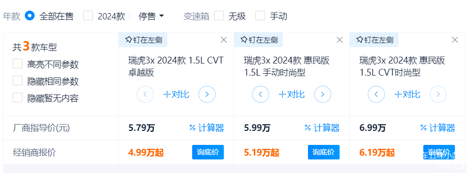 作为奇瑞布局入门级市场的核心车型, 瑞虎3x聚焦预算5-8万元的年轻首购用户与家庭代步需求。其5.79万-6.99万元的售价极具诚意,在同级别中形成“低价不低质”的核心优势,成为下沉市场与城市通勤的热门选择。
