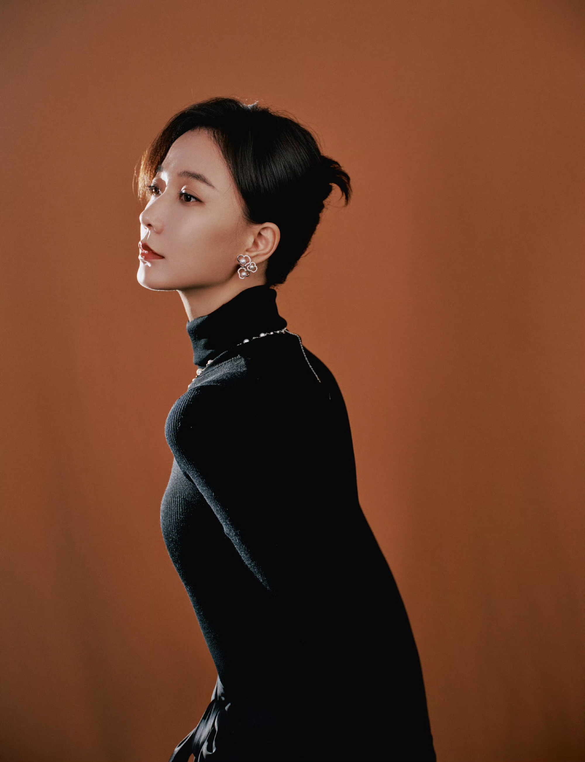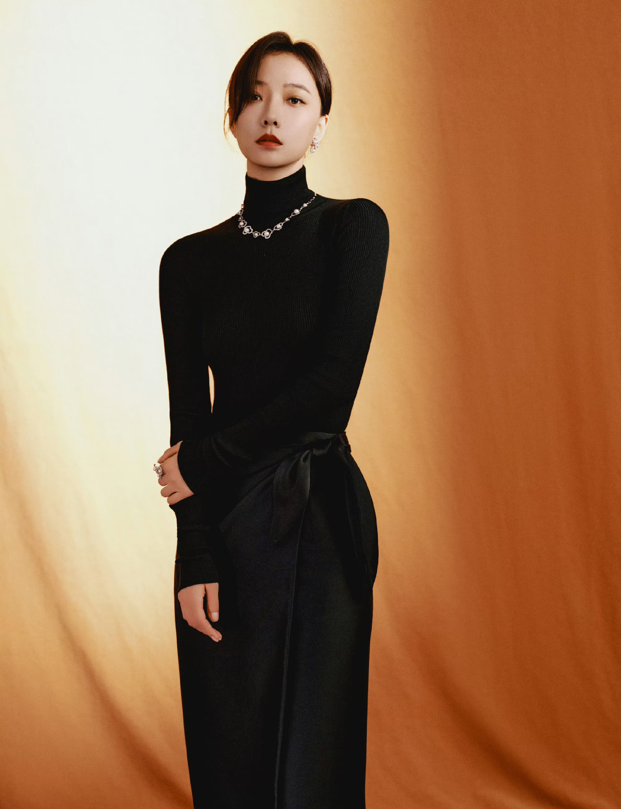 王珞丹身着黑色高领针织衫,搭配深灰色缎面绑带长裙,脚踩黑色漆皮高跟鞋,钻石项链戒指点缀出华丽精致感。