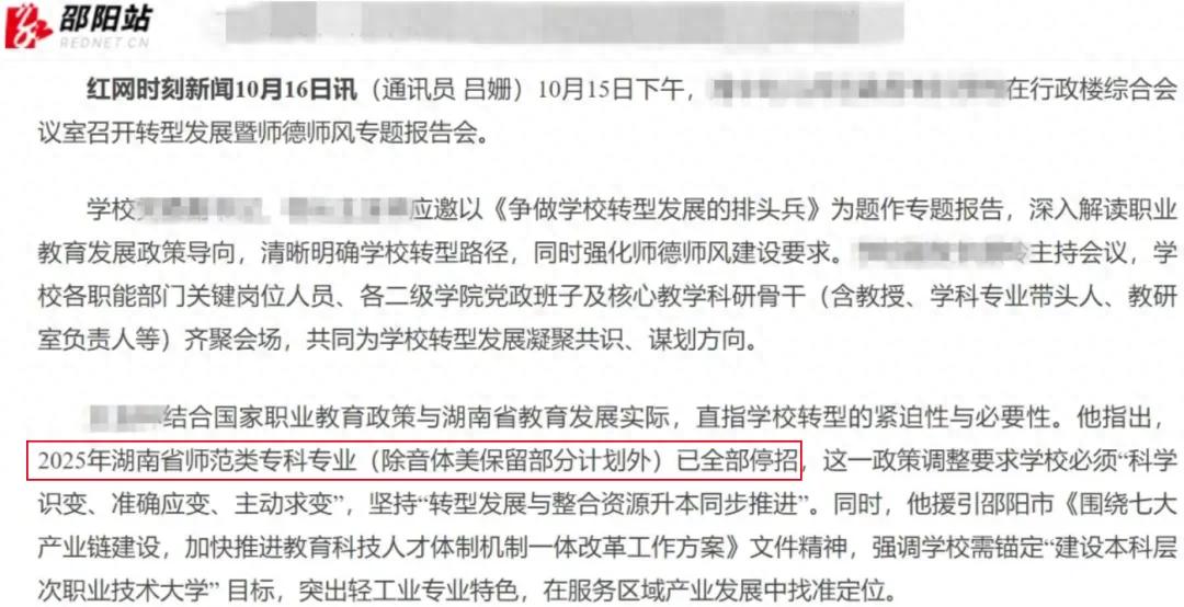 据红网时刻新闻消息,2025年10月,在湖南某幼专召开的会议上,该校领导指出,2025年湖南省师范类专科专业(除音体美保留部分计划外)已全部停招,这一政策调整要求学校必须“科学识变、准确应变、主动求变”,坚持“转型发展与整合资源升本同步推进”。
