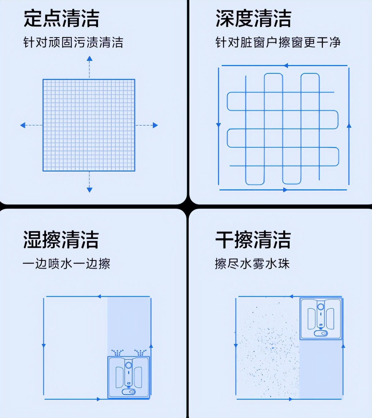 采用锁水无痕技术的高密度纤维抹布,擦拭更干净,仿人手75N强力去污,四维边框智能感应,紧密贴合擦拭,拥有四大清洁模式运用AI智感主控芯片,感知周围环境,自动避障清洁,自动规划路径,语音智能播报,实时获取信息,全程语音反馈,从启动到收工配备一键换布,一键收线功能。不过它的智能避障能力较弱,遇到窗框等障碍物时容易卡顿,路径规划的灵活性有待提高,在复杂窗格环境下,可能会出现重复清洁或漏擦的情况,
