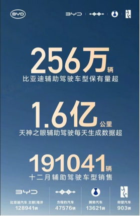 产品力的全面进阶为销量护航,智驾技术成为加分项。截至 2025 年 12 月,比亚迪辅助驾驶车型累计保有量超 256 万辆,稳居中国车企第一。“天神之眼” 智驾系统日均生成 1.6 亿公里数据,94.13% 的激活比例印证用户认可,12 月单月辅助驾驶车型销量近 19.1 万辆,其中王朝&海洋系列贡献 12.89 万辆,高端车型表现亮眼。全年 933 万次 AEB 自动紧急刹车触发,以及泊车安全损失兜底承诺,让智驾成为用户购车核心考量。