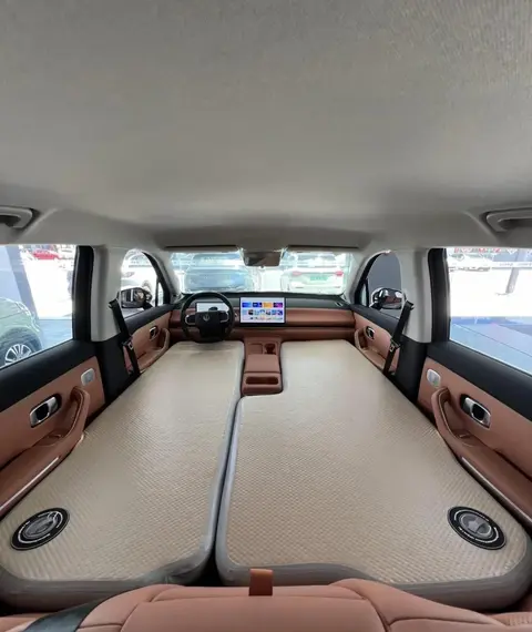 座椅配置方面,采用有机硅环保面料,亲肤无毒且易于清洁。高配车型的前排和第二排座椅均支持加热、通风和按摩功能。第二排座椅靠背调节角度可达145°,接近半躺姿态。副驾驶座椅后部还配备了语音控制的小桌板,方便后排乘客使用。