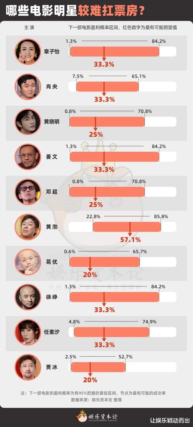 在老牌明星扛票房能力衰落的趋势中,章子怡的境遇是独一档的。尽管下一部电影的盈利概率较低只有33.3%,但她还是具有不可替代性。