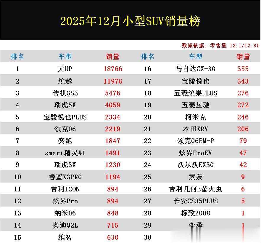 导读:如今的小型SUV市场已从过去的百花齐放进入到了强者恒强、新旧交替的激烈竞争阶段。电动化、智能化以及高性价比的车型已成为了决定市场销量的关键因素。根据乘联会方面最新公布的2025年12月小型SUV零售量排行榜数据显示,榜单头部阵营中,新能源以及高性价比的车型已成功占据榜单主导,其中比亚迪元UP登顶销量冠军,缤越则稳居第二,传祺GS3荣获第三,瑞虎5X、宝骏悦也PLUS均闯入前五,领克06、奕跑、smart精灵#1、瑞虎3X、睿蓝X3PRO均名列榜单前十。昔日长期统治者这一细分市场日系本田缤智、本田XRV表现让人惋惜,仅排在第15名和第21名,销量已不及部分国产车型的零头。国产大胜!12月小型SUV销量榜:缤越亚军,奕跑第7,本田XRV第21