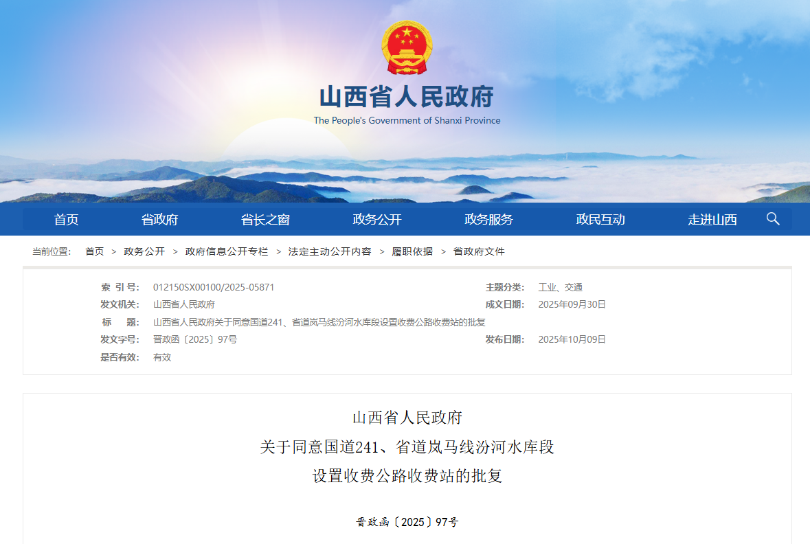 《关于国道241、省道岚马线汾河水库段设置收费公路收费站的请示》(晋交财发〔2025〕290号)收悉。现批复如下: