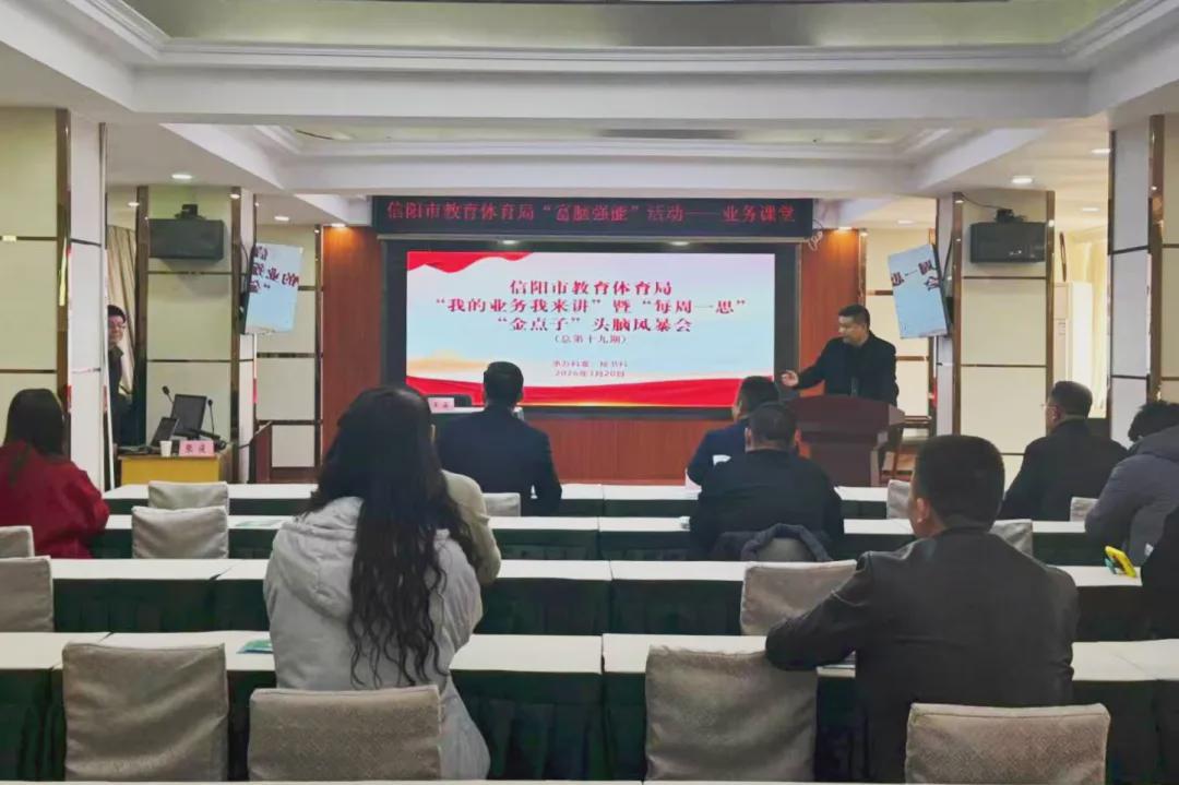 今年以来,信阳市教育体育局(简称市教体局)深入贯彻市委“破除中梗阻、提升软环境”专项行动部署,精准实施“富脑强能”能力提升计划,以“专家讲堂、干部学堂、业务课堂、小微书堂”四大阵地为抓手,创新开展系列赋能活动,推动系统党员干部政治素养、业务能力、服务水平全面提升,为教体强市建设注入强劲动能。