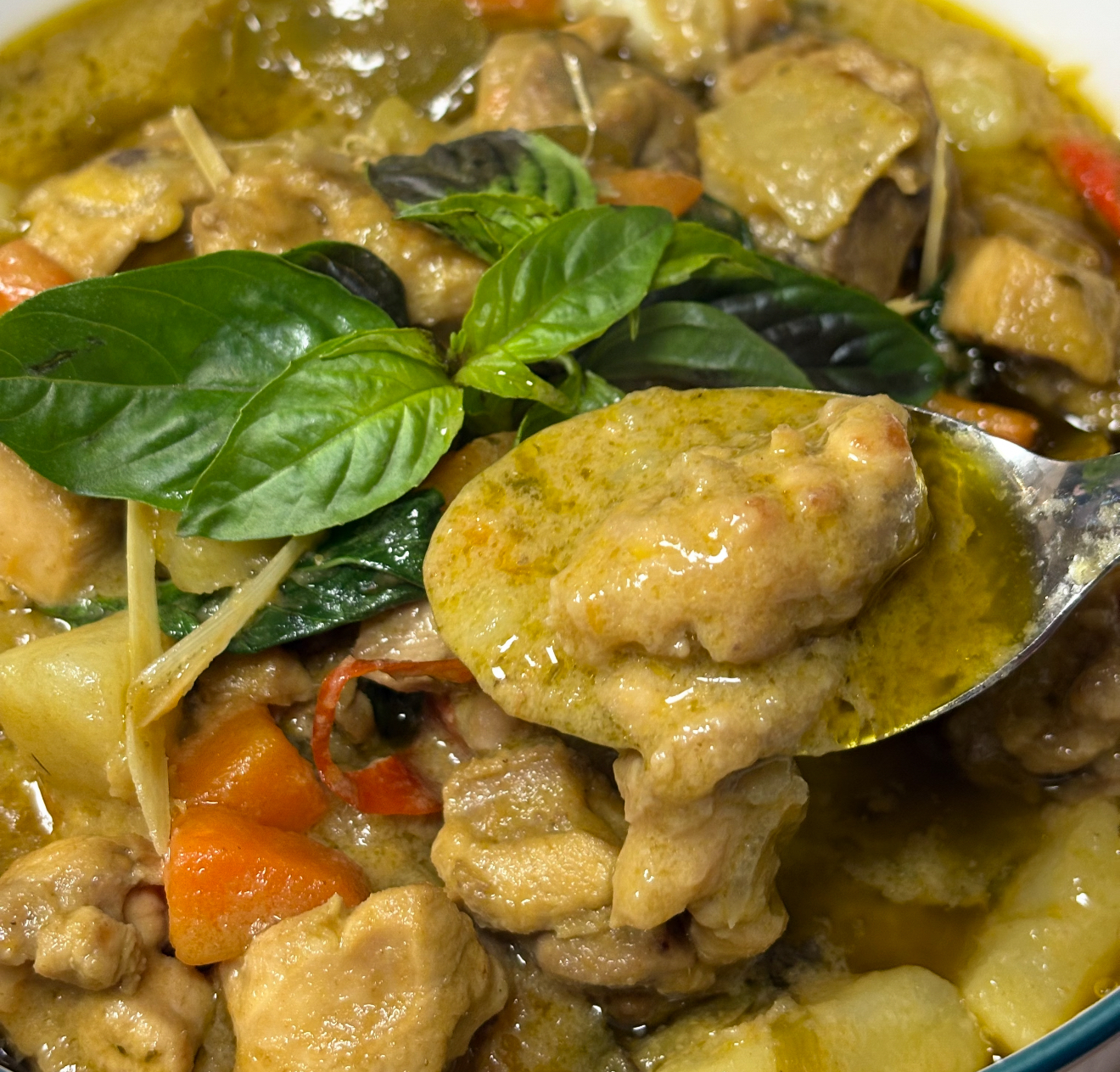 这道起源于泰国中部的料理,最初是农民们的田间午餐。用现摘的香草和随手可得的椰浆,就能把最普通的鸡肉变成下饭神器。如今它漂洋过海,在各国厨房里演变出无数版本,但那份融合了清新与火辣的矛盾美感始终未变。