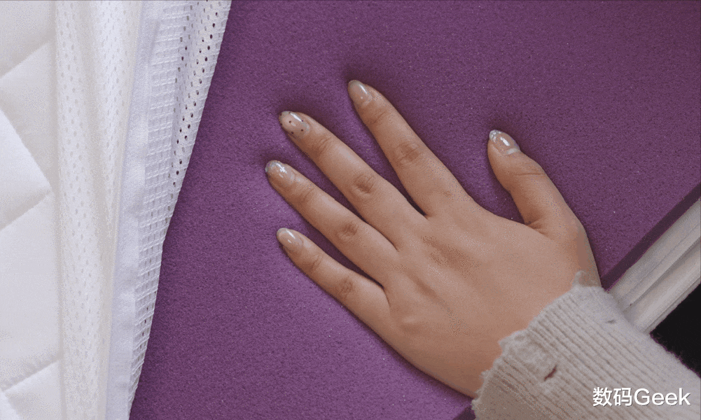 所以这里栖作用采用了更好的方式来解决,我们拆开床垫就可以看到,床垫内部由两层不同成分的MDI海绵组成,默认紫色的无感高透气的记忆棉在上,这样的话有效保证更饱满的贴合感,不至于因为硬质床垫从而带来的不适感。