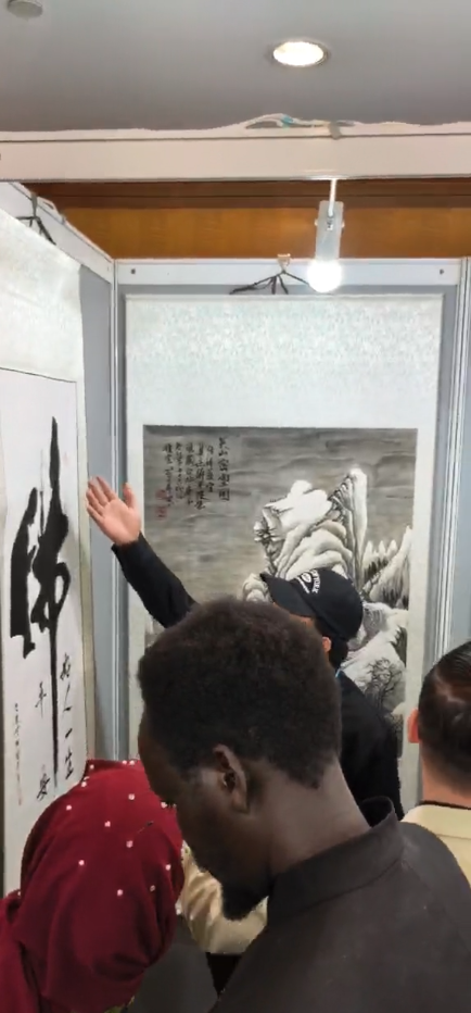 在活动现场主办方工作人员现场讲解邵国平老师的作品‘得到了来自多个国家的外交人员观看并给予了高度的重视。