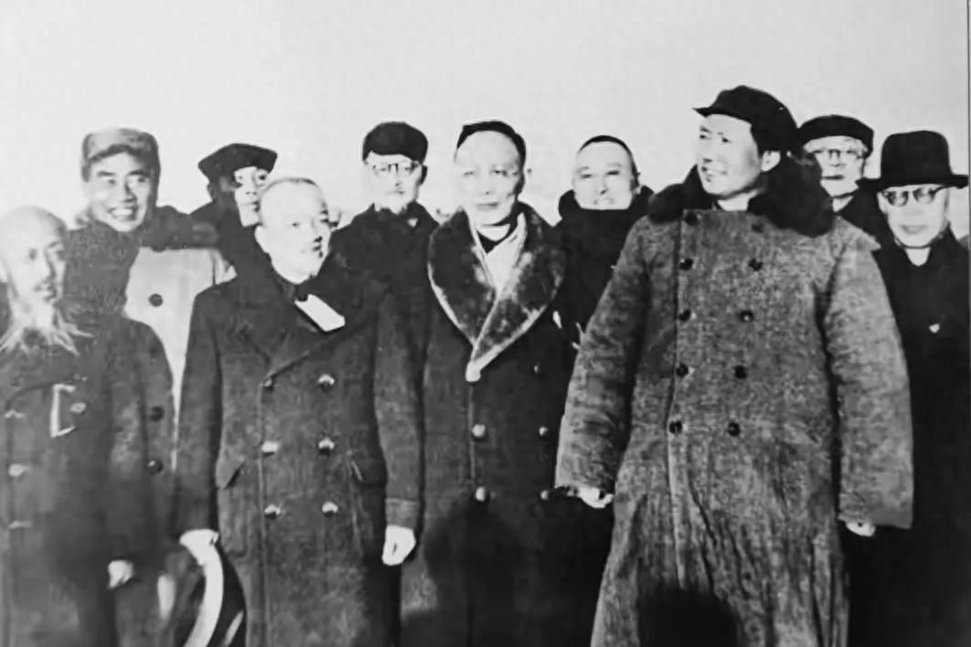 1949年3月25日,毛主席等率中共中央机关和人民解放军总部进入北平。这是同前来迎接的民主党派负责人和其他民主人士在西苑机场合影。左起:沈钓儒、朱德、董必武、李济深、陈其援、郭沐若、黄炎培、毛泽东、林伯渠、马叙伦。