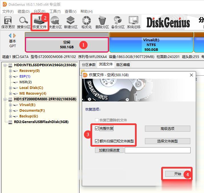 点击这部分区域,点击【恢复文件】,然后选“完整恢复”和“额外扫描已知文件类型”。之后点击【开始】按钮。