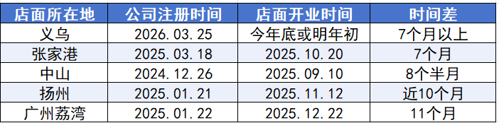 通过对比以上数据发现,多地店面从注册公司到实际开业,中间所需时间少则7个月,多则近一年。就拿刚刚成立公司的义乌来讲,据官方媒体报道,义乌山姆会员店最早将在2026年年底开业,最迟不超过2027年。
