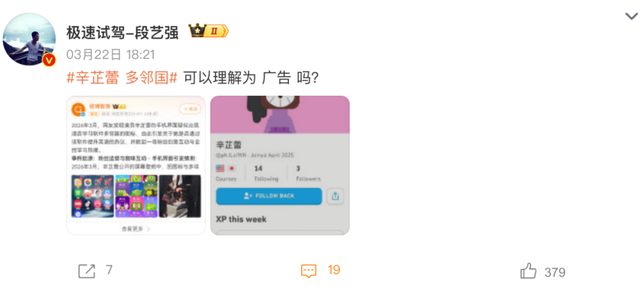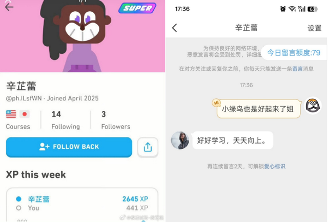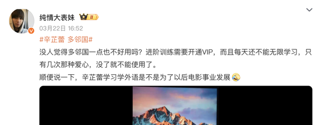 第三个机缘,是发现辛芷蕾手机屏幕中的软件疑似多邻国app的博主是辛芷蕾粉丝,经常更新辛芷蕾的动态。这一次她还直接@辛芷蕾。