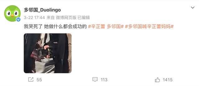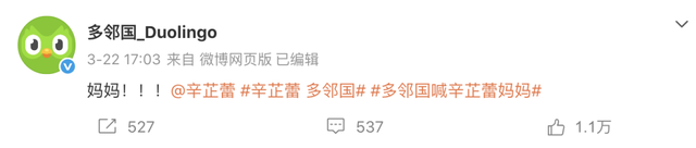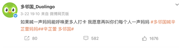 而擅长跟热点的多邻国也是火速下场,一句“妈妈”让话题#辛芷蕾 多邻国#冲上了热搜。