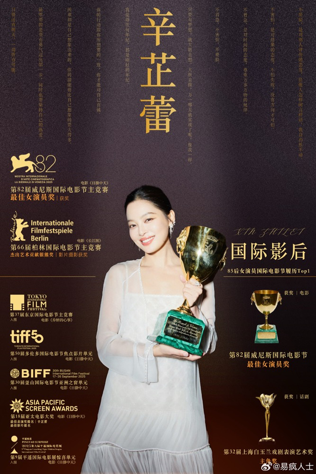辛芷蕾,2025年威尼斯影后得主。她身上的标签有“努力的演技派”、“逆袭大女主”、“耿直清醒”等正向词条。