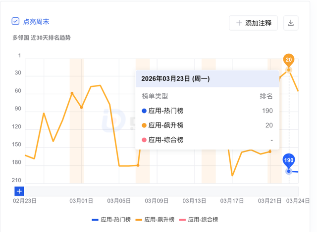 随着辛芷蕾和多邻国这对破次元的组合在社交媒体上迅速发酵,一场“跟辛芷蕾一起卷英语”的热潮也迅速蔓延开来。有人重回多邻国学英语、晒打卡记录,也有人跟上学习脚步,成为多邻国新用户。公开数据显示,多邻国3月22日登点点数据教育榜TOP2(近一个月一直处于TOP3以及TOP3外),3月23日冲上点点数据应用飙升榜TOP20,为近30天最好成绩。