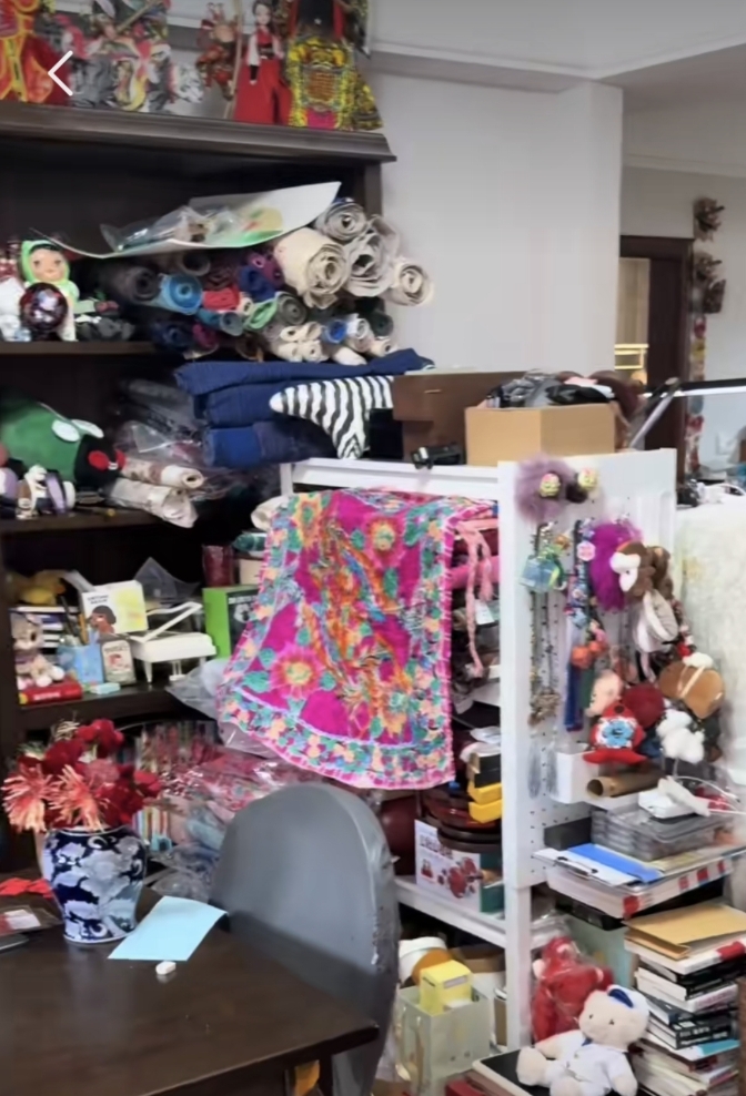 客厅那个书桌后面,胡老师老在那儿做手工、画画、看书,挺会享受。可家里乱得啊,看得人头皮发麻,东西多得没处下脚。