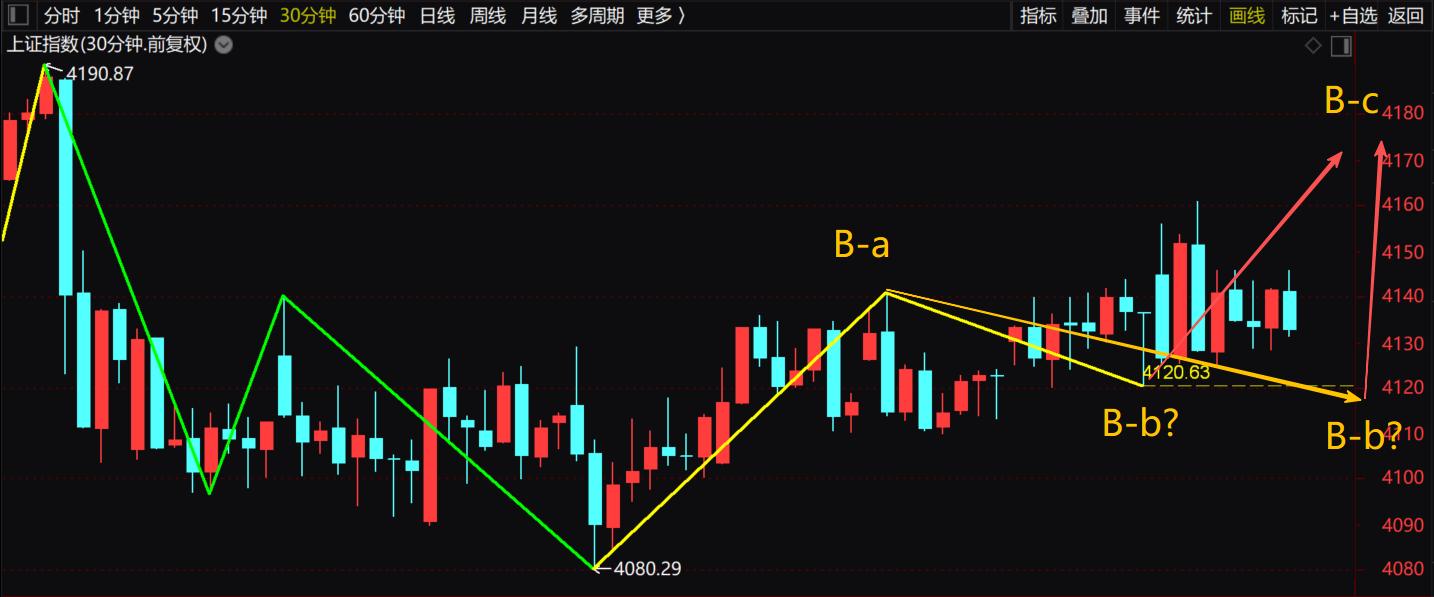 审视30分钟图,我们不难发现,当前市场可能正处在B-b浪的尾声或者B-c浪的开端,因此,对明天走势进行分析时,可以将B-b浪尚未结束作为主导思路。若明日出现新低,其低点预计将在4118附近,这之后,市场可能启动B-c浪的反弹,届时有望触及并超越4190点的新高。从时间周期来看,本周四,也就是从4080点起始的上涨第八天,可能是B-c浪发力的关键节点。