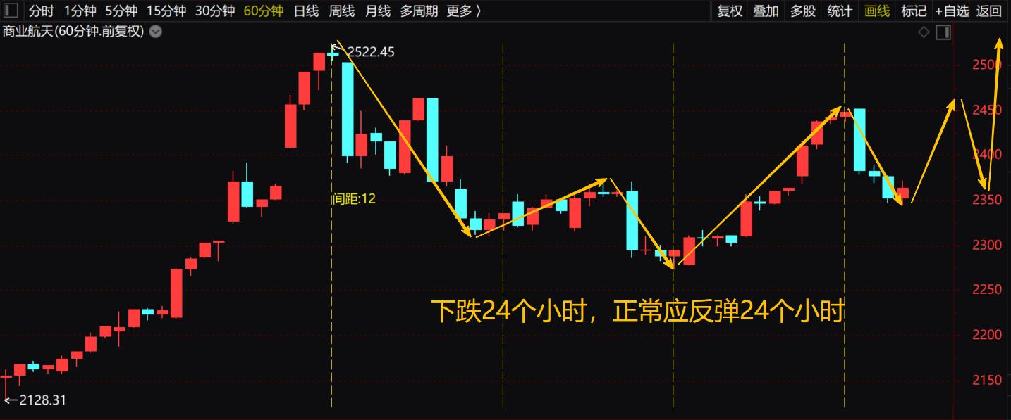 接下来是商业航天板块,经过今天的暴跌,可以说是对上周强势反弹的一次正常调整,波浪理论角度来看,或许可以将此次下跌视为B-b浪的一部分,之后可能还会出现B-c浪的反弹,而这与大盘指数基本保持同步。预计本周上半周,商业航天板块或将持续运行在B-b浪中,也就是说,明后两天市场可能还会经历一次上涨和一次下跌的反复,直到周四左右,B-c浪反弹才有望开启。