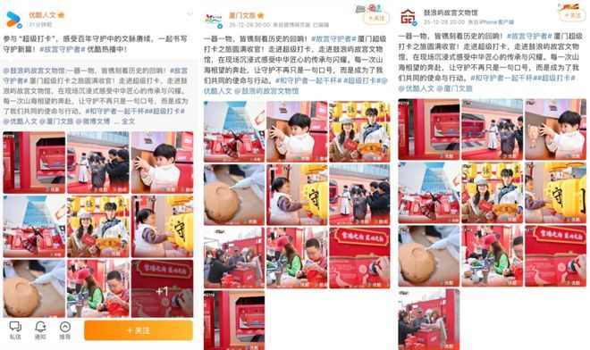 节奏紧密衔接,线上+线下玩转宠粉。TOP君观察到,线上「超级打卡」在《故宫守护者》播出发酵一周后上线,线下快闪紧随其后空降厦门。这种近乎“零时差”的衔接进一步放大“宠粉”体验,为“云守护”到现实中的“守护认证”带来更强烈的冲击感。
