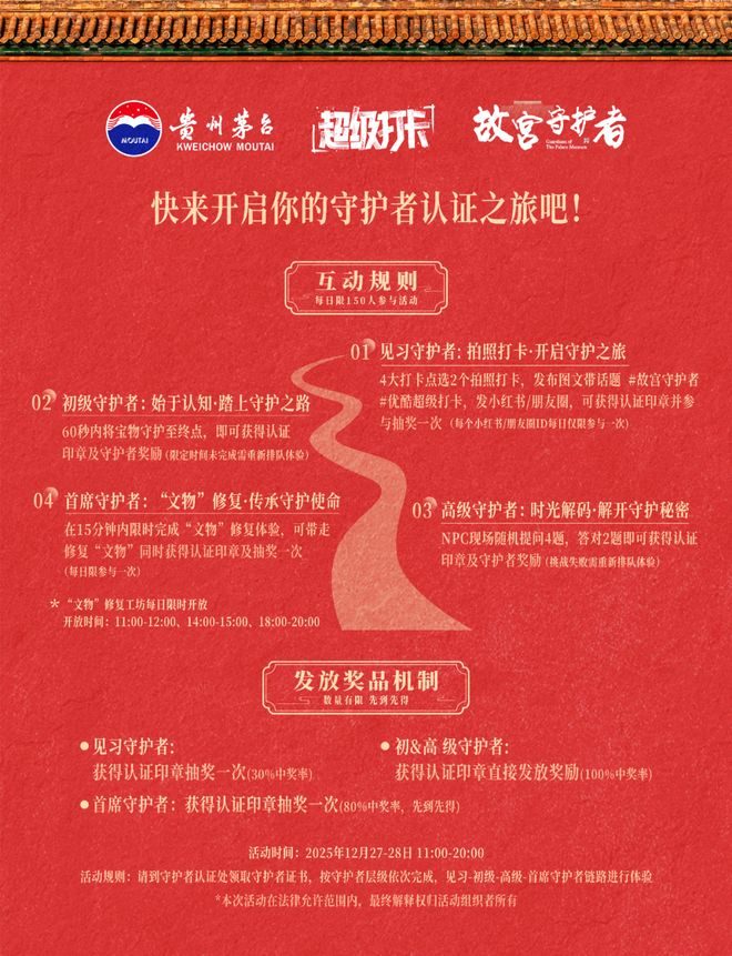 这场整合营销以一场线下快闪为落脚点——12月27日-28日,《故宫守护者》×贵州茅台酒(精品)「超级打卡」线下快闪在厦门成功举办。线下快闪以“守护者认证”为主线,设计了见习守护者、初级守护者、高级守护者、首席守护者4个打卡任务。
