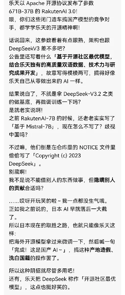 如果只是拿开源模型微调,其实在科技圈也算常规操作。但乐天错就错在“吃相太难看”。有博主详细梳理了乐天的骚操作: