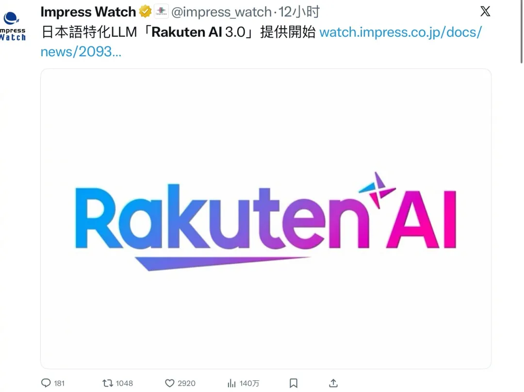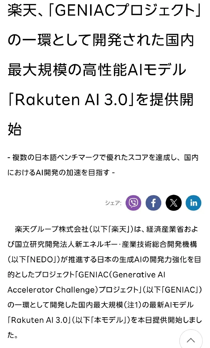 公告里宣称,作为日本经济产业省和NEDO推进的“GENIAC项目”的一环,他们成功开发了国内最大规模的最新AI模型——Rakuten AI 3.0。