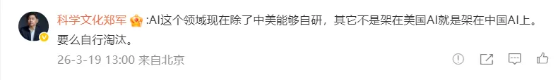 大V指出残酷真相:现在AI领域除了中美能自研,其他国家要么架在美国AI上,要么架在中国AI上