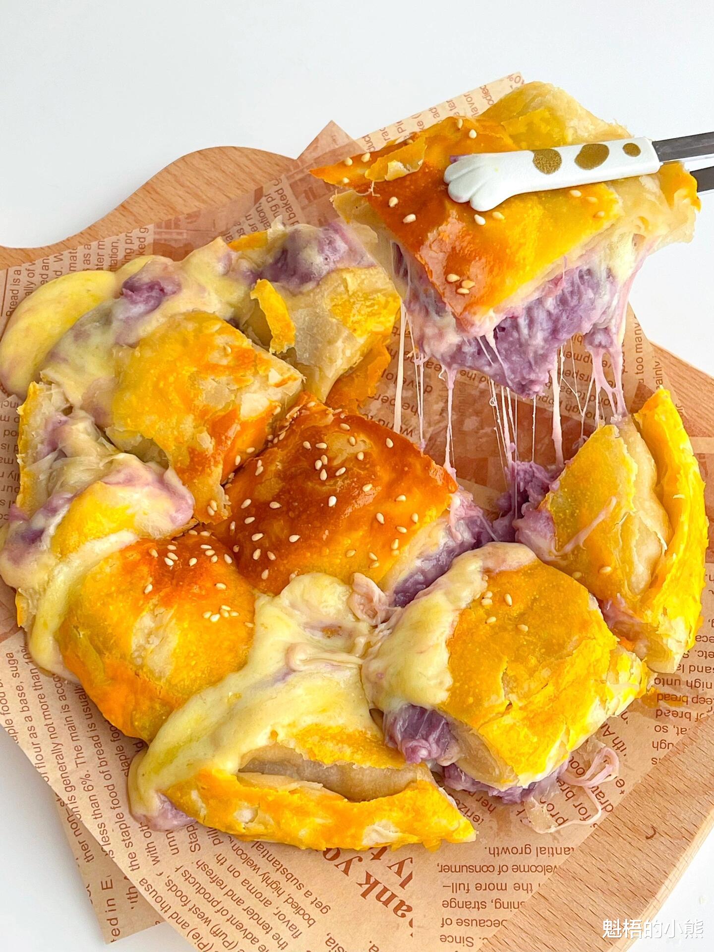 刚出炉的芝士芋泥饼色泽金黄、外皮酥脆,一刀切下,清脆的“咔嚓”声悦耳十足,内里柔软的紫色芋泥裹挟着融化的奶白芝士。趁热掰开,芝士拉出绵长不断的丝,软糯治愈;芋泥入口即化、甜而不腻。外皮酥脆掉渣,内馅温热香甜,酥、糯、香、甜、咸多重口感层层碰撞,在舌尖交织出满满的幸福感。搭配一壶红茶或是一杯冰美式,就是氛围感十足的下午茶。红茶的微涩中和甜腻,冰美式的清苦衬托芋泥的香甜,口感层次直接拉满。吃不完的芋泥饼可以密封冷藏,次日用空气炸锅复烤五分钟,依旧酥脆好吃。