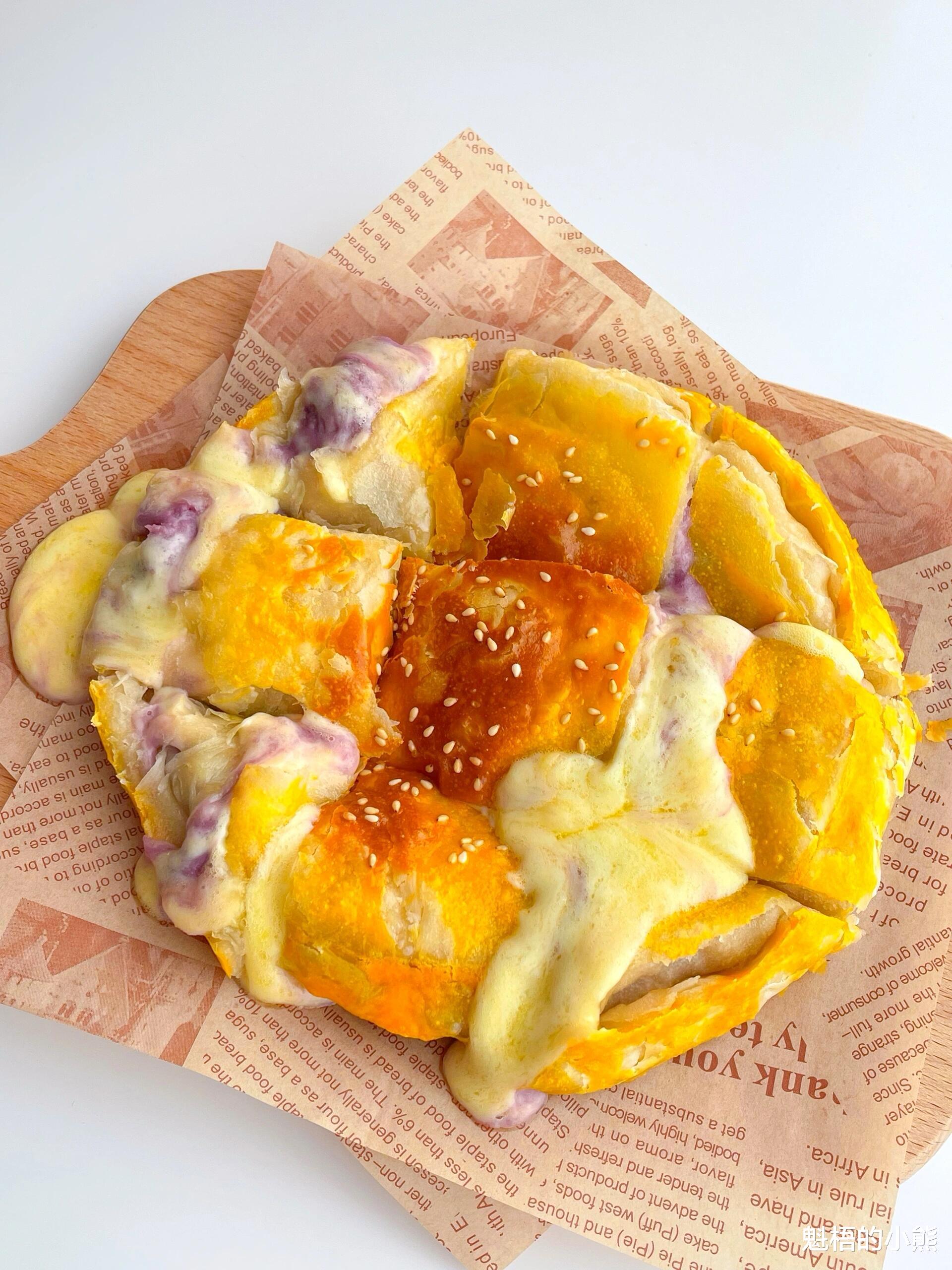 芋泥的绵密香甜、芝士的咸香拉丝、手抓饼的酥脆掉渣——这三种食材组合在一起,几乎不可能不好吃。第一次做这个芝士芋泥饼,纯粹是嘴馋了。翻出冰箱里的荔浦芋头和手抓饼,想着简单填点馅料烤制,没想到出锅时直接惊艳。金黄的饼皮层层酥脆,切开后芋泥的柔紫与芝士的奶白相互交融。趁热咬一口,外壳“咔嚓”作响,内里软糯绵密,芝士拉出绵长的丝,甜咸平衡,清爽不腻。孩子放学回家,连书包都来不及放,抓起一块就大口品尝,边嚼边说:“妈妈,这个比外面卖的还香。”从这以后,这道爆浆芝士芋泥饼,就成了我家下午茶的常驻点心。做法十分简单,不用揉面、不用烤箱,一台空气炸锅就能轻松搞定,芋泥爱好者一定要试试这个神仙搭配。
