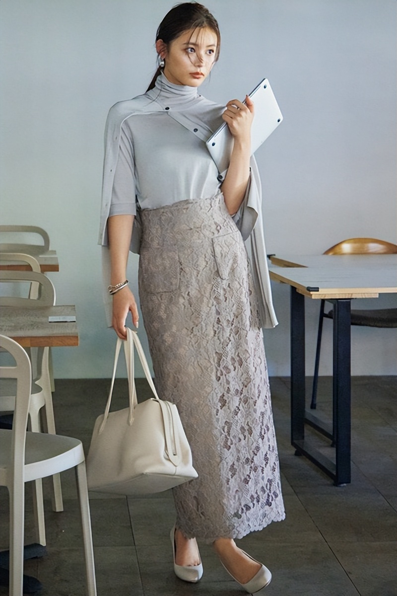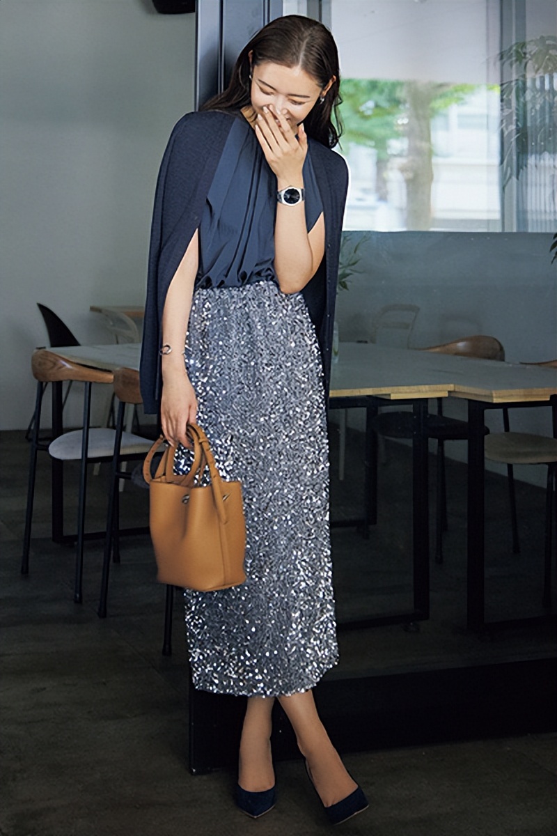 紧身的贴合半身裙在灰色底上装饰着银亮片,颜色与海军上衣或开衫协调不突兀。这样的造型打扮优雅又充满松弛感。