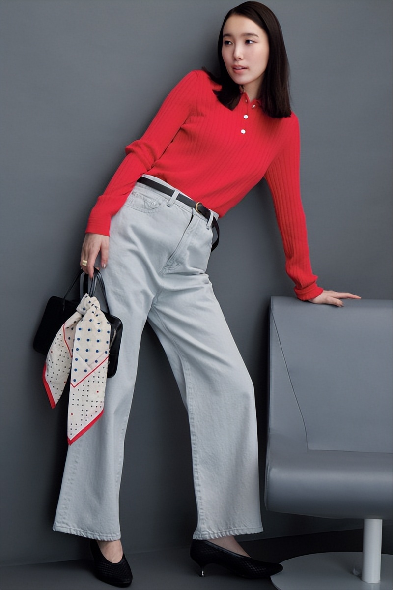 细微的灰色牛仔布和红色的polo针织的吸引力以中等的配色方式中和。在保持红色独有的“主角”时,灰色的配色,它也会带来轻松的外观。黑色腰带+黑色鞋子包包形成同色系搭配,高级又显高。