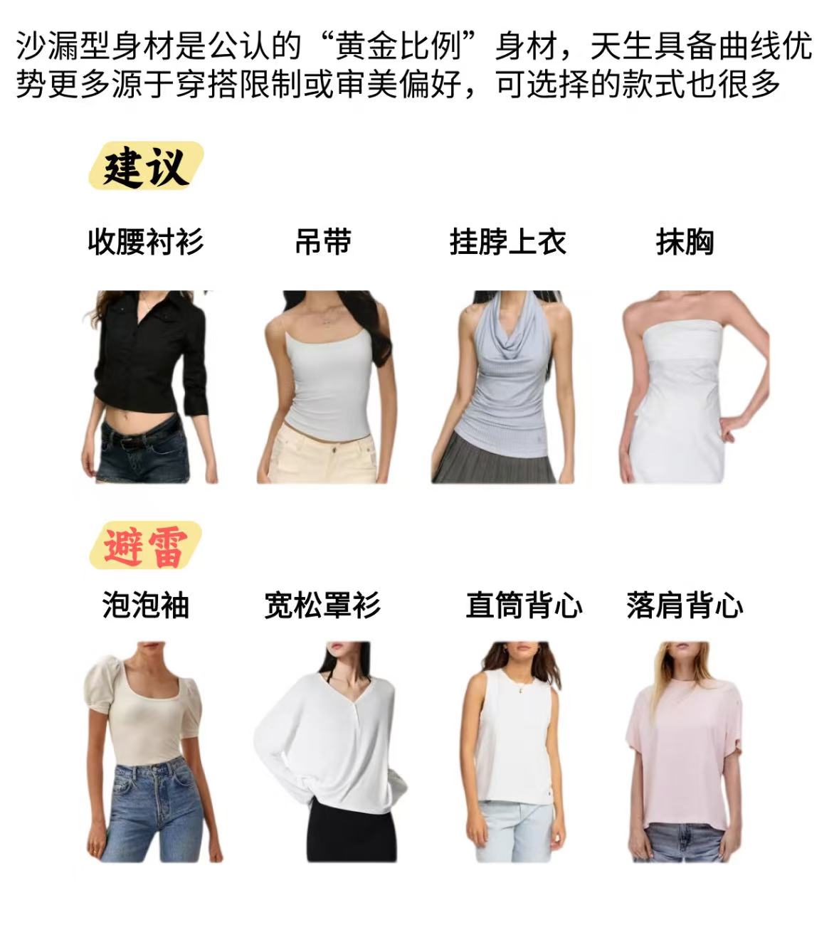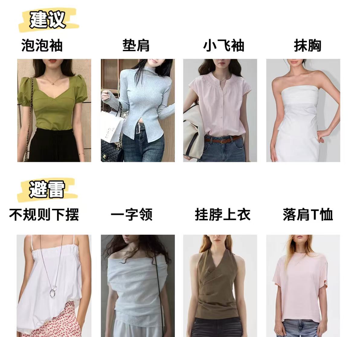 上装:V领/U领、垂坠感好的衬衫、H型短外套。避免紧身和腰部有复杂装饰的上衣。