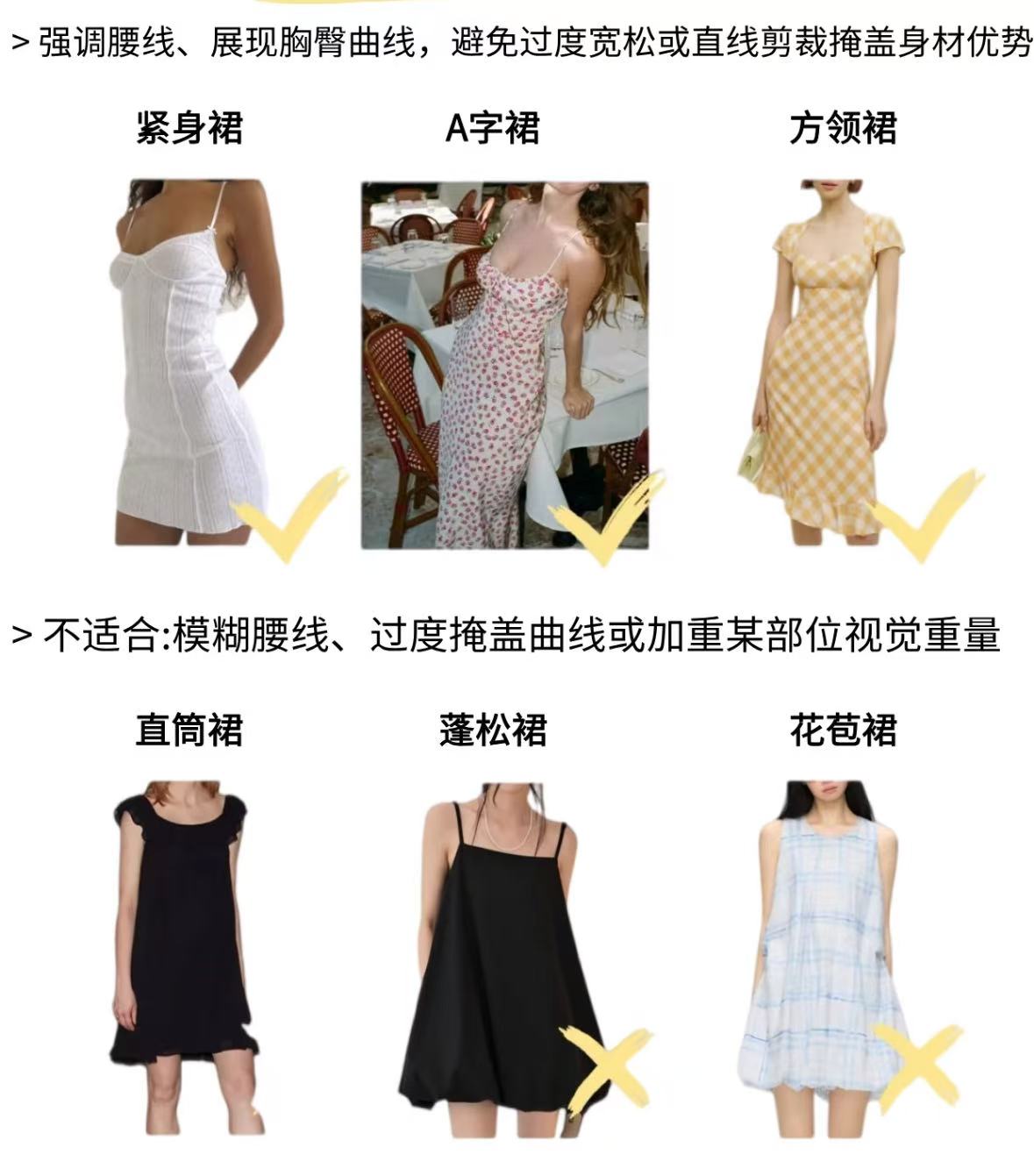 下装:铅笔裙、包臀裙、高腰直筒/微喇裤。所有下装都应突出高腰线。X型收腰连衣裙是最佳单品。