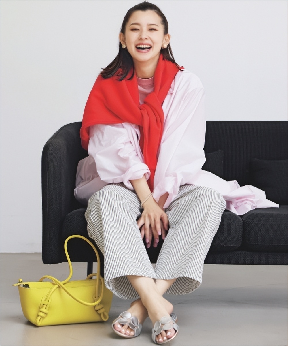 一件长竖条纹的衬衫,配上棉麻的直筒裤,即可创建穿搭上的三维形状。内搭为红色,即使没有配饰,也一样摆脱路人甲,穿出好气质。