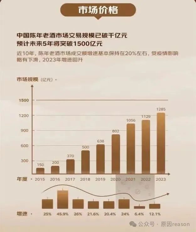 据年初京东和中国酒业协会联合发布的《2024年京东超市陈年老酒消费趋势报告》显示,目前中国陈年老酒市场交易规模已破千亿元,预计未来5年将突破1500亿元。