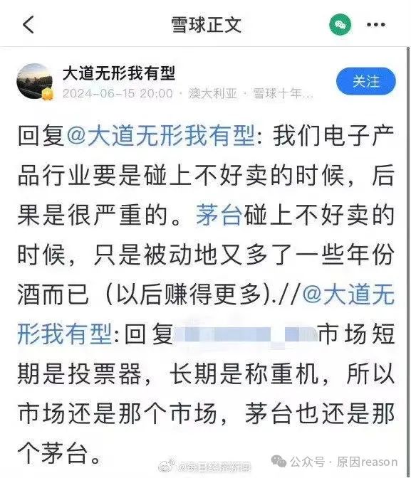 在回帖中,段永平还表示:“电子产品行业要是碰上不好卖的时候,后果是很严重的。茅台碰上不好卖的时候,只是被动地又多了一些年份酒而已(以后赚得更多)。”