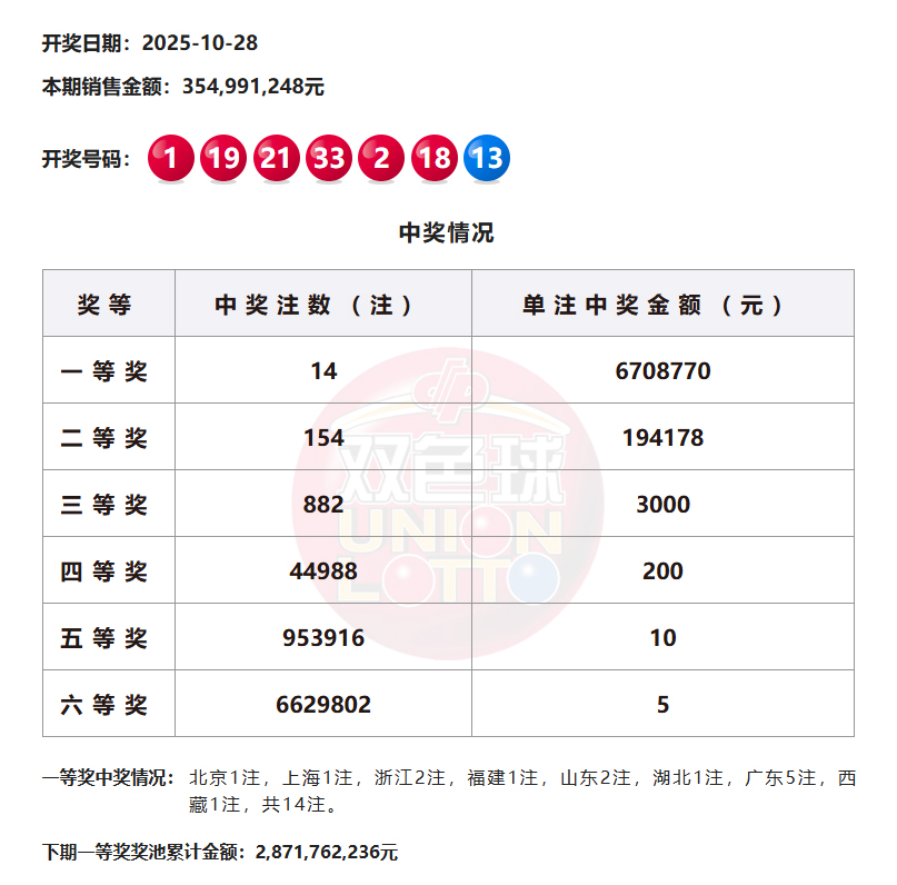 本期一等奖中奖情况:北京1注,上海1注,浙江2注,福建1注,山东2注,湖北1注,广东5注,西藏1注,共14注。