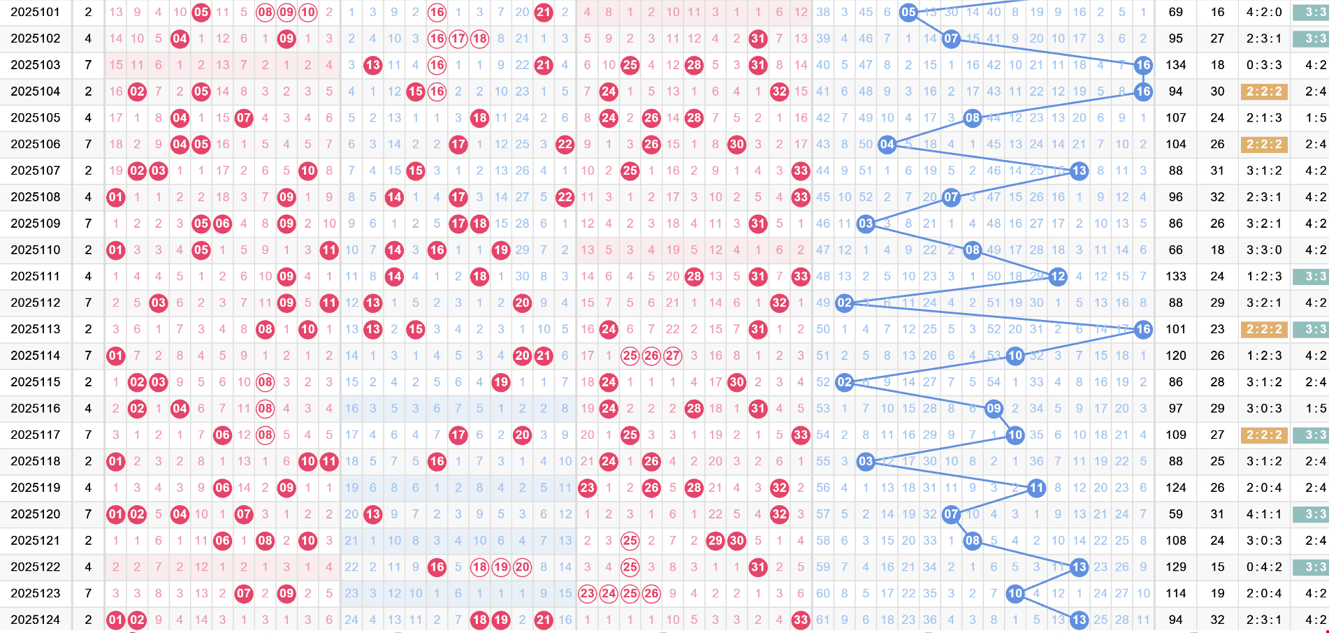 近二十期走势,遗漏,和值如下