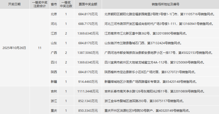 第2025123期中奖明细,包括具体投注地点,投注站号如下