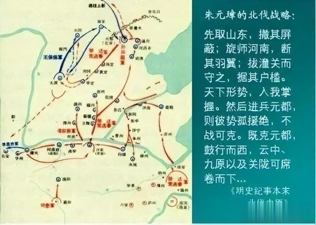 朱元璋说:“吾欲先取山东,撤其屏蔽;旋师河南,断其羽翼;拔潼关而守之,据其户枢。天下形势,入我掌握,然后进兵元都,则彼势孤援绝,不战可克。既克其都,走行云中、九原,以及关陇,可席卷而下矣。”