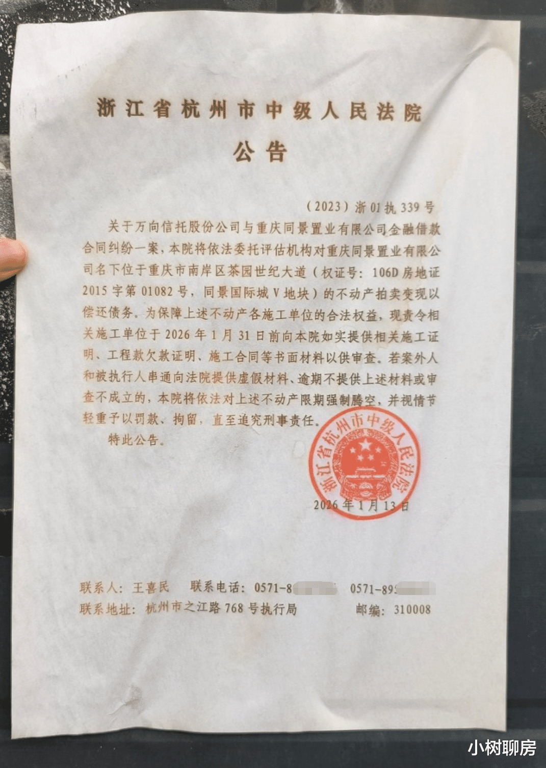 这个项目是如何沦落到拍卖地步的呢?现场看到一份张贴的“浙江省杭州市中级人民法院公告”,显示案由为“万向信托股份公司与重庆同景置业有限公司金融借款合同纠纷案”。
