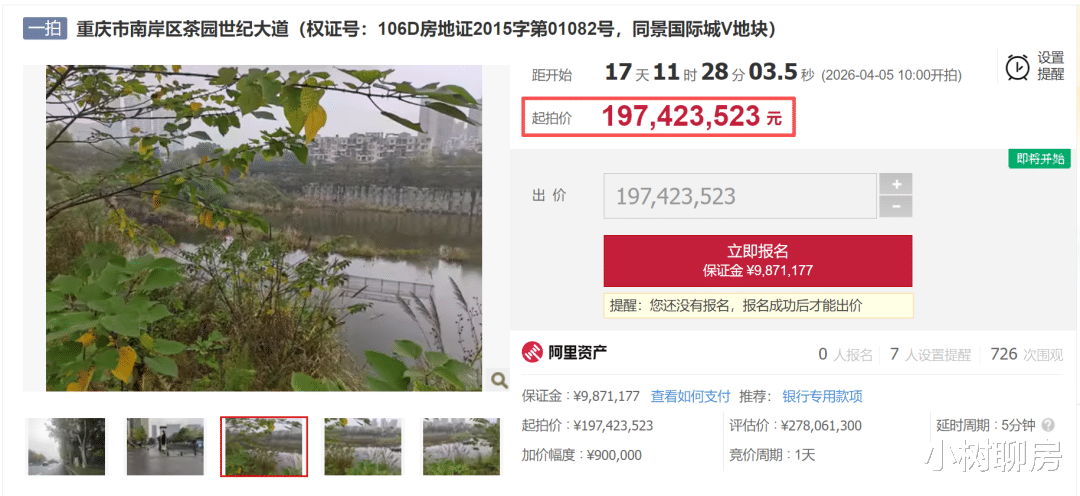 近日,重庆楼市传出一个重磅新闻。在某拍卖网上,位于南岸区茶园的同景国际城V地块被端上了拍卖席,起拍价1.97个亿,拍卖时