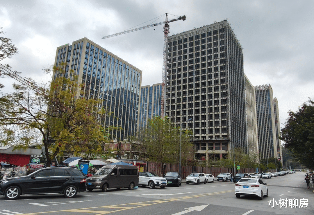地图显示,同景国际城位于地铁6号线邱家湾站的旁边。小树从地铁站刚出来就看到旁边几栋高大的商务楼,其中有一栋外立面处于“裸奔”状态,没看到任何施工迹象。