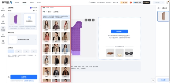 接下来就是选择模特了,你可以在工具的预设模特库里挑选,里面有海量不同风格不同身材的模特,不管你是做欧美风还是日韩风的围巾,都能找到匹配的,如果你有自己想要的特定模特,比如你的品牌有固定的代言人,也可以自行上传自己的模特图来使用,保证品牌形象的统一。