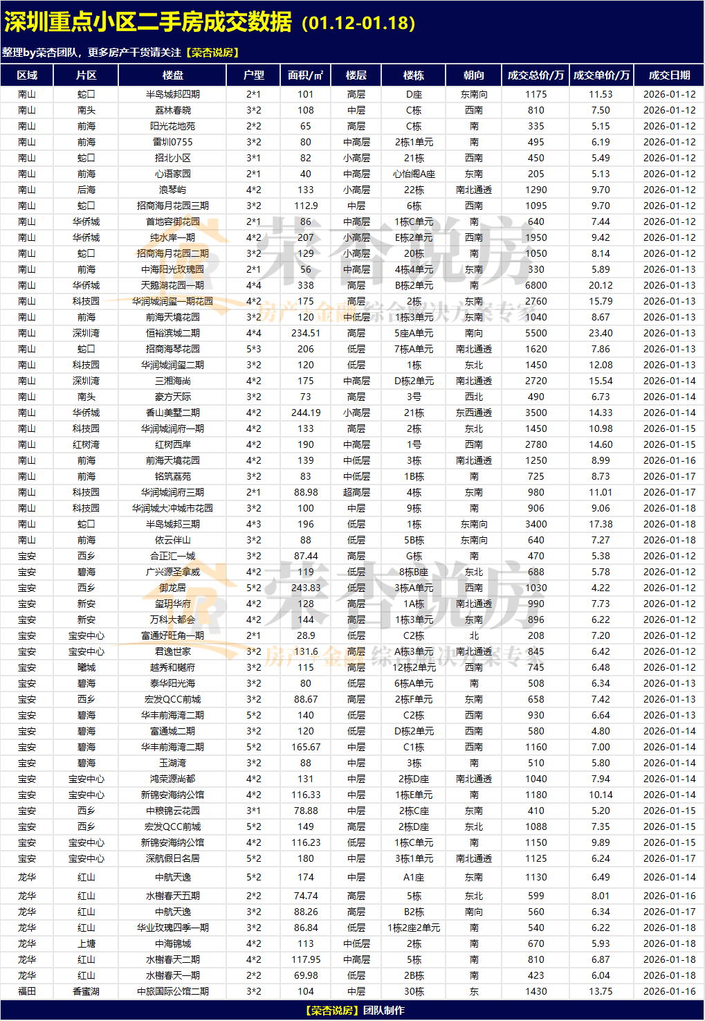第一部分为深圳重点小区二手房成交信息,以南山、宝安、福田、龙华为主。