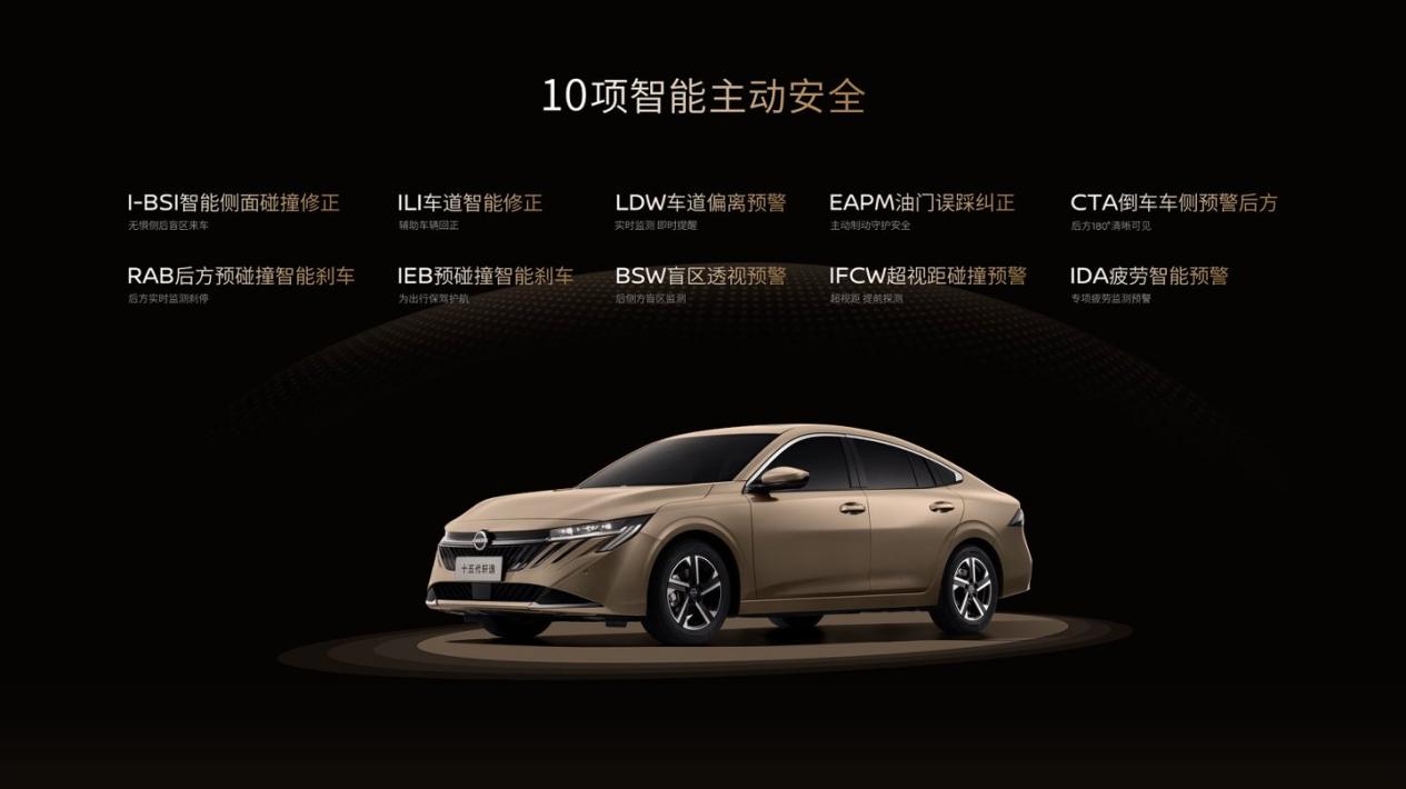 安全防护上,十五代轩逸构建 **“主动 + 被动” 双重安全保障体系 **。主动安全方面,搭载包含 ICC 全速域自适应巡航、LKA 车道保持辅助在内的 L2 级智能驾驶辅助系统,有效缓解驾驶疲劳,提升高速、拥堵等不同路况下的行车安全性。针对中国复杂的道路路况,新车新增多项贴心安全科技:IEB 预碰撞智能刹车系统新增自行车识别功能,防护更全面;I-BSI 智能侧面碰撞修正可在并线时辅助纠偏,规避侧面风险;EAPM 油门误踩纠正专注低速场景防护,减少操作失误带来的意外。