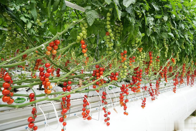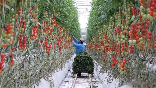 不同于传统农业生产,产业园里处处充满“科技感”。霍尔果斯农业科技发展集团党委委员、副总经理袁伟介绍,区别于传统的日光温室和露天栽培,产业园采用智能温室技术,为作物提供稳定的生产环境,使得番茄可以一年四季持续生产。“得益于无土栽培、双层高分子功能膜覆盖、智能精准控制、二氧化碳回收利用等六大核心技术系统,我们实现了对温度、光照、湿度和二氧化碳浓度的精确控制,确保农作物的规模化、自动化生产。”借助现代化的管理技术,霍尔果斯现代农业科技产业园的番茄采摘期长达9个月,产量是普通番茄的7倍以上,每个主茎可以长出6-8个花序,一根藤结果47次,2024年共产出番茄6480吨。