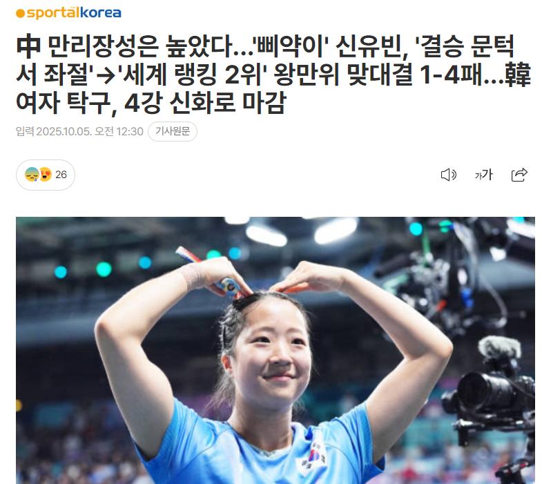 在刚刚结束的WTT北京大满贯女单半决赛中,虽然韩国乒乓球选手申裕斌未能进入决赛,但她的表现依然令人瞩目。这场比赛,她以1-4的比分输给了世界排名第二的中国选手王曼昱,但却在赛后展现了令人称赞的心态和风度,面带灿烂笑容,向支持她的球迷挥手致意,显示出非凡的成熟和自信。